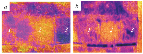 Infrared images of the samples (a) before and (b) after mowing; 1—sample 1, 2—sample 2, 3—sample 3.