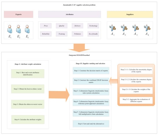 The remainder of this paper is organized as follows. In Section 2, recent studies on sustainable supplier selection and MAGDM methods are reviewed and analyzed. In Section 3, some basic concepts of 2DLIFV are briefly reviewed. In Section 4, the integrated MAGDM method based on 2DLIF-BWM and 2DLIF-MULTIMOORA method is presented. In Section 5, a numerical example of UAV supplier selection is studied to show the process of the proposed method. The experimental results are analyzed in Section 6. Finally, Section 7 concludes the paper.