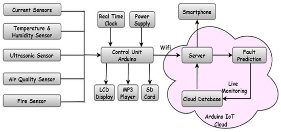 The developed system for real-time data monitoring and fault prediction provides support and identifies clinical/hospital devices as well as sends early notifications if a fault occurred [31]. This system uses current sensors, Arduino and a machine learning algorithm. The machine learning algorithm consists of the random forest classification model. As per Figure 1, there are multiple types of sensors attached to the control unit of the clinical/hospital design. These sensors are current, temperature and humidity, ultrasonic, air quality and fire sensors [58]. The data are captured by the control unit, which saves this data to the SD card, as well as transferred to the cloud server by the control unit. The cloud server processes the real-time data with a data processing unit and a machine learning algorithm for fault prediction and classification [59]. The machine learning algorithm has been trained over huge amounts of datasets. Therefore, it needs to process the data for fault prediction and classification which updates the data with the corresponding results. After fault prediction, the data are getting saved in the cloud which the end-user can access through the server via smartphone application. The fault prediction algorithm applies the random forest classification [60,61] to predict the faults in the incoming data during the process. In the end, all the historical sensor data related to current sensors, temperature and humidity, ultrasonic, air quality and fire are sent to the front end in real-time through a cloud server with fault prediction results [62].