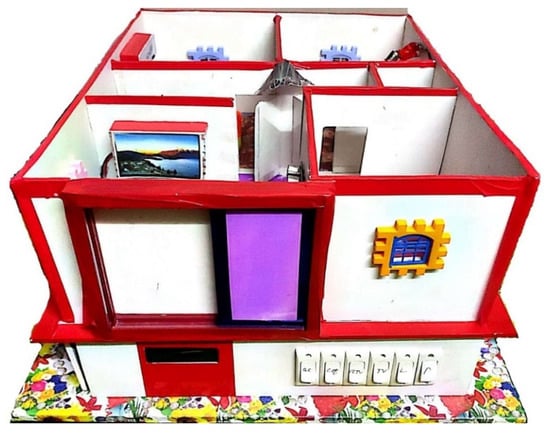 The prototype of the proposed model is made using a board and connected via glue as shown in Figure 7. Once the model is prepared, then it is populated with furniture, sensors and devices. There are a total of five rooms in the proposed model along with a sliding door and motion sensor on that door to detect the motion of a person. There are some switches on the model to induce the fault in devices.