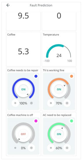 Figure 8 shows the mobile application made for showing the results of fault prediction having different gauges. A gauge is a display widget that displays the values of different sensors present inside the clinic/hospital environment. The colors in Figure 8 define the status of the device. The green color symbolizes working fine, blue means needs to repair and red means a need to replace. In this, the solutions are also given according to the values received by the sensors and devices. A total of four cases are there, namely, working fine, can be repaired, needs replacement and main power supply off. The values send the output in one of the above cases which are represented by the mobile application, and the user is informed regarding the same.