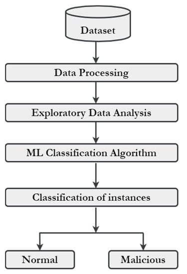 Figure 10 presents the flowchart of fault classification using a machine learning algorithm. Firstly, the dataset is taken and processed to analyze its parameters. An analysis of data is conducted using exploratory techniques to find out the different patterns of faults. Then, an ML classification algorithm is applied to classify the instances based on the patterns identified during the above techniques. Now after classification, malicious and normal devices are identified, and fault is predicted.