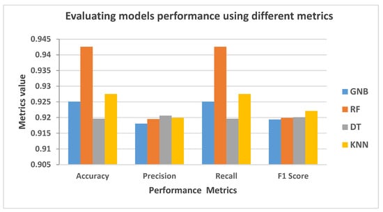 Four classification models named KNN, GNB, RF and DT are used to evaluate the dataset using different metrics. To handle large volumes of data and complex training of the systems, deep learning can be used in the future. Figure 12 illustrates the metric values of different machine learning models. RF has the highest accuracy of 94.25% and recall as compared to others. The precision and F1 score of RF is a little bit less than DT, but due to a small difference between values, RF is considered the best based on the accuracy metric.
