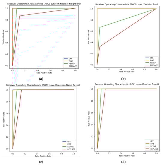 The classifier that produces the ROC curve closer to the top-left corner performs better as compared to the curve along with the diagonal. The closer the curve is to the 45-degree diagonal, the less accurate the classifier. The plots in the graph shown in Figure 13d are closest to the top-left corner which shows their best accuracy in detecting faulty and non-faulty devices. The ROC curve for classifier DT is the closest to the diagonal which shows its least accuracy in detecting faulty and non-faulty devices, whereas the ROC curve for classifier KNN and ROC curve for classifier GNB perform more accurately than DT but less accurately than RF. Thus, the ROC curve for classifier RF shows its maximum accuracy as compared to other classifiers. The range of current (in ampere) for all devices in our model is short. For example, if the average current value is 9 A, the permissible range lies between 8 A and 10 A, which means, the fluctuation occurring in any device is within the range +1 to −1. Therefore, in our dataset, different sensors are within a pre-defined range, which causes minimal statistical fluctuations. Thus, the ROC curves are plotted as straight lines.