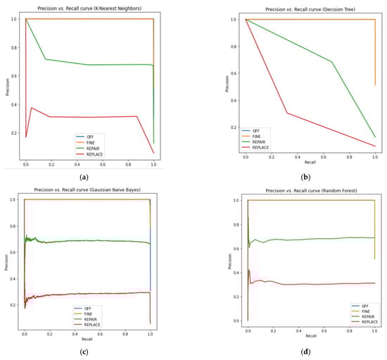 Figure 14 shows the PR curves for KNN, GNB, RF and DT, respectively. The random forest classification algorithm achieves better results than others, as a large area under a PR curve proves high precision and high recall. More precision means a low false positive rate and a high recall means a low false negative rate. All devices in our model have a limited current range (in amperes). For example, if the average current value is 3 A, the permissible range is 2 A to 4 A, implying that fluctuation in any device is between +1 and −1. As a result, different sensors in our dataset are within a pre-defined range, resulting in minimal statistical fluctuations. The key in calculating precision and recall is that it does not use true negatives. It is only concerned with predicting the minority class correctly. In our dataset, there is a significant class imbalance as the non-faulty cases (off and fine classes) are found to be the most, and faulty cases (repair and replace classes) are minimal. Furthermore, in PR curves, the accuracy is said to be the most if the precision and recall values tend to ‘1’. In the graph presented in Figure 14, the majority of cases (non-faulty cases), i.e., the ‘OFF’ and ‘FINE’ classes are represented in blue and yellow plots, respectively. The plots of both cases have reached the value ‘1’. The major challenge of the proposed work is privacy and the security of training data present on the cloud. However, computing a false positive is a major threat to the validity of the results.