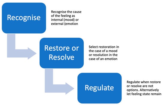 Our 4R model presented in Figure 1 is based on distinctions between emotion and mood previously reported in the academic literature and by non-academics (see Table 1 and Table 2) [11], as well as the reasoning presented above. It recognises that despite mood and emotion often feeling very similar, the factors that cause moods are different to those that cause emotions. Given that mood and emotion signal the need to deal with these causes, theoretically, different strategies are required to deal with an unpleasant mood compared to those that might be effective in dealing with an unpleasant emotion. The 4R model is presented in Figure 1 and its components; Recognise, Restore, Resolve, or Regulate, explained below.