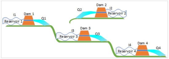 In Figure 2, I1, I2, I3, and I4 are the inflows, and Q1, Q2, Q3, and Q4 are the discharge rates. It is clear from the figure that reservoir 3 has water input from the discharge of dam 1 and dam 2.