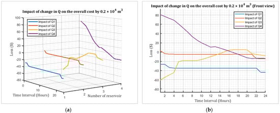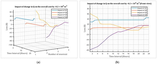 Impact of change in Q on the overall cost by “−0.2 × 104 m3”: (a) 3D view and (b) front view.