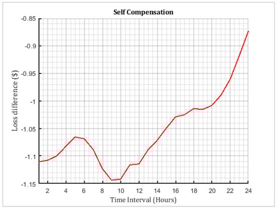 In some cases, compensation is required to be performed in its reservoir. In that case, the impact of change in discharge rate itself in different hours is studied. Figure 5 shows the difference in loss values versus hours. Here, the difference in loss values is determined by Equation (17). Figure 6 describes how much more costly it is to decrease the Q than increase it in a given hour.