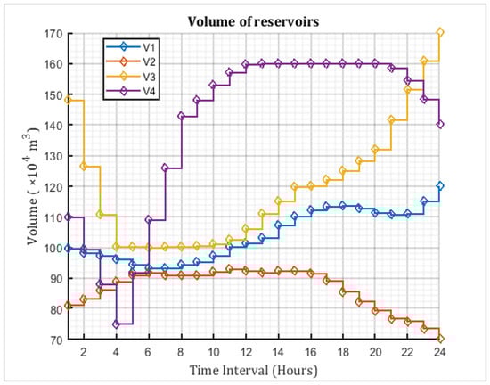 The consideration of initial and final volumes of the reservoirs makes the test system realistic in 24 h short-term scheduling. The values are given in the Appendix A. As the initial and final volumes are the same at the end of each day, the reservoir is set to its initial state and the cycle begins.