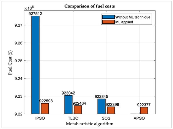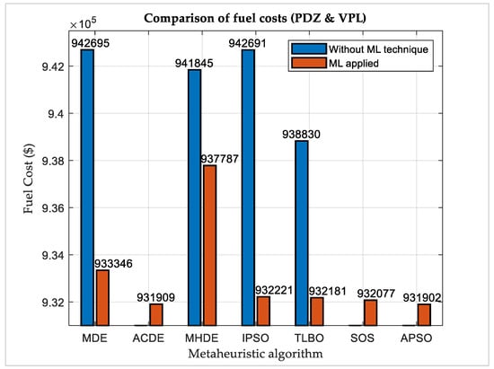 It appears quite pertinent and even desirable to point out at the outset that the limits of prohibited discharge zones are considered to be exclusive. In some publications, such as [15], it is considered to be inclusive. The solution to STHTS with PDZ is by applying the machine learning (ML) model to the APSO algorithm using exponential decays of α and β. The minimum cost comes out to be 922,376.57 (USD). This cost is found as the minimum among the past results on prohibited discharge zones. Table 1 shows the hourly plant discharge, power generated by each power plant, and the fuel cost in each interval of time. Figure 8 explains the volumes of reservoirs in different time intervals. A comparison of the results with the previous ones is given in Table 2. Figure 9 graphically explains the comparison of the results with PDZ. The table shows that the proposed technique can be applied to the other metaheuristic algorithms and the cost of thermal generation can be significantly minimized for prohibited discharge zones. The second to last and last column show the amount of money that one can save if the proposed machine learning technique is applied for PDZ instead of only using metaheuristic algorithms. Without any suppression of fact, the metaheuristic algorithms are used first to solve STHTS without PDZ. The solution is then passed through the model to give a low-cost solution for the PDZ case.