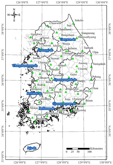 In this study, daily data obtained from sixty-two meteorological stations were collected (Figure 2). The fifty-seven meteorological stations (excluding Jeju) had automated synoptic observation system (ASOS) data collected for more than 30 years, from 1981 to 2021. The five meteorological stations (Andong, Changwon, Taebaek, Bonghwa, and Cheorwon) collected data from 1983 to 2021, when continuous observation data existed.