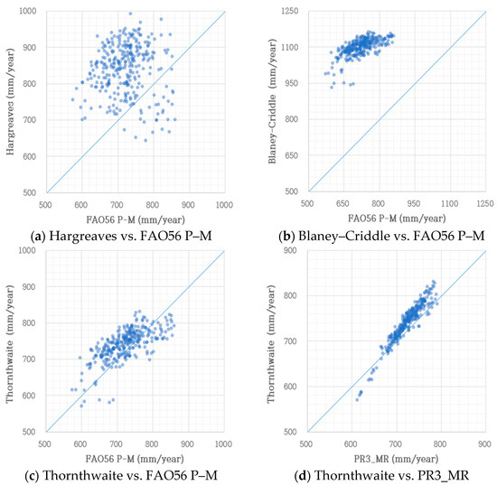 For the error with FAO56 P–M, the Hargreaves equation had a high error rate with an RMSE of 149.00 mm/year and R2 less than 0. This meant that there was no correlation, and this was an abnormal case where the prediction performance was lower than the model predicted by the mean value. The RMSE of the Blaney–Criddle equation was excessive at 378.75 mm/year. However, the Thornthwaite equation had an RMSE of 44.44 mm/year with FAO56 P–M, which was the same for PR3_M and PR3_MR, with RMSEs of 41.32 and 40.49 mm/year, respectively. The Hargreaves or Blaney–Criddle equations were not appropriate for annual ET0, and Thornthwaite showed the best error among the empirical equations. Similar to the daily and monthly results, the polynomial regression machine learning showed the closest results to the FAO56 P–M in annual reference evapotranspiration, and it was appropriate as an alternative to the temperature-based empirical equation.