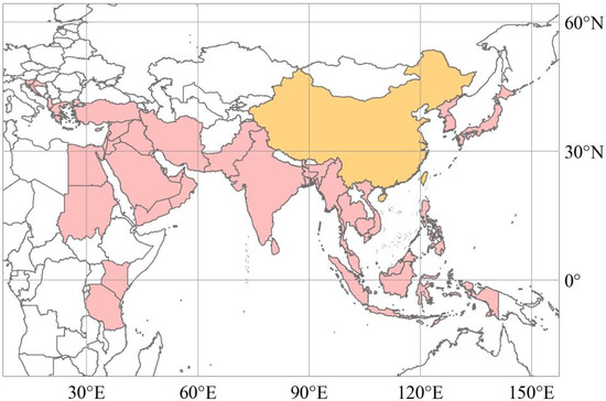 Referring to the Ancient Maritime Silk Road and related research [32,33], this study selected 39 MSRCs, such as Japan, the Philippines, and India, as the research area (Figure 1). To facilitate the analysis, Japan, South Korea, and North Korea are divided into three East Asian countries; Indonesia, Thailand, Malaysia, Vietnam, Singapore, the Philippines, Myanmar, Cambodia, and Brunei are divided into nine Southeast Asian countries; India, Bangladesh, Pakistan, and Sri Lanka are divided into four South Asian countries; Saudi Arabia, the United Arab Emirates, Oman, Iran, Turkey, Israel, Kuwait, Iraq, Qatar, Jordan, Lebanon, Bahrain, Yemen, and Syria are divided into fourteen West Asian countries; Greece, Slovenia, Croatia, Albania, and Cyprus are divided into five Balkan countries; and Egypt, Kenya, Tanzania, and Sudan are divided into four African countries.