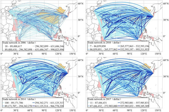 According to the weighted degree measurement of trade network weighted degree from 2006 to 2017, the weighted degree of most countries in the MSRCs trade network showed an upward trend, and the average weighted degree increased from 7.03 × 1010 to 1.20 × 1011 (Table 1). The node centrality is positively correlated with trade flow. The trade flows of China, Japan, and South Korea are much larger those that of other countries, which makes the node weighted degree of China, Japan, and South Korea always in the top three. In 2006, Japan had the largest centrality, and its trade flow with MSRCs was the largest. With the advancement of China’s economic development and the construction of the Maritime Silk Road, the trade flow between China and MSRCs has continued to increase, driving China’s node weighted degree in the MSRCs’ trade network to continue to rise. From 2006 to 2017, China’s node weighted degree in the MSRCs’ trade network increased from 4.98 × 1011 to 9.81 × 1011 surpassing Japan to become the country with the highest node centrality in the MSRCs’ trade network and the core of the MSRCs’ trade network. South Korea and Japan have developed economies with high economic extroversion and large trade flows. The node weighted degree of the two countries was ranked second and third from 2010 to 2017, becoming central in the MSRCs’ trade network, second only to China. It is worth noting that the gap between South Korea’s centrality and that of Japan is constantly narrowing. In 2006, South Korea’s centrality was 62.75% of Japan’s, and South Korea’s centrality was 90.92% of Japan’s in 2017. This shows that the trade flow between South Korea and MSRCs was growing rapidly, which promoted the rapid improvement of South Korea’s centrality in the MSRCs’ trade network.