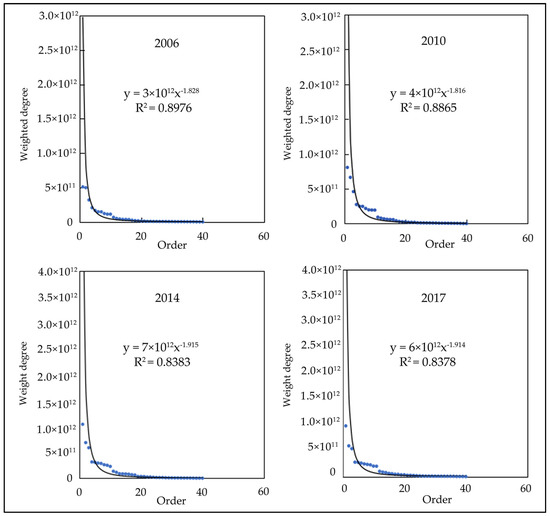 In terms of regions, Egypt, Tanzania, Kenya, and Sudan have increased their centrality in the MSRCs’ trade network. The four South Asian countries, except Bangladesh, have experienced a significant increase in the centrality of the MSRCs’ trade network, while the five Balkan countries have changed their centrality slightly in the MSRCs’ trade network, and the trade network centrality rankings of Southeast and West Asian countries have both experienced upward and downward trends. This further indicates that the trade centrality of the regions along the Maritime Silk Road is not stable and that the centrality pattern of the trade network fluctuates significantly. In addition, the power function fitting analysis was carried out on the weighted degree distribution of the MSRCs’ trade network, and it was found that the top 25% of node weighted degrees accounted for more than 80% of the total weighted degree in 2006, 2010, 2014, and 2017 (Figure 3). The fitting relationship coefficients of the trade network weighted degree and power function were all greater than 0.8. The weighted degree of a few nodes is very high, and the weighted degree of most nodes is very low, indicating that the distribution of the nodes’ weighted degree in the MSRCs’ trade network follows the long-tail distribution law, and the scale-free characteristics are significant.