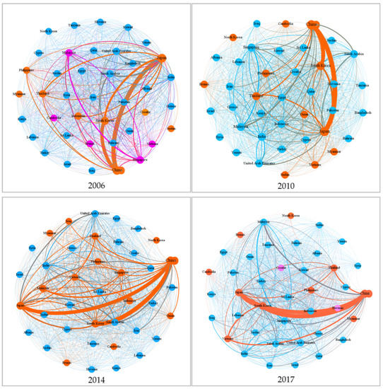 Gephi software was used to analyze the topological structure of the trade network, and the topological structure maps of the MSRCs trade network were obtained (Figure 4). In 2006, China, Japan, and South Korea, the top three countries in the weighted degree of the trade network, accounted for 17.71%, 18.15%, and 11.39% of the total weighted degree of all MSRCs, respectively. There is little difference in the centralities of the three countries in the MSRCs’ trade network. During this period, the MSRCs’ trade network exhibited a tripartite pattern for China, Japan, and South Korea (Figure 4). In 2010, the trade network weighted degree of Japan and South Korea decreased in proportion to the total weighted degree of all MSRCs, while the trade network weighted degree of China increased in proportion to the total weighted degree of all MSRCs. In 2014, the proportion of China’s weighted degree in the total weighted degree of all MSRCs continued to rise, and the proportion of South Korea’s weighted degree in the total weighted degree of all MSRCs increased to 13.04%, while the proportion of Japan’s weighted degree in the total weighted degree of all MSRCs further decreased. In 2017, the weighted degrees of China, Japan, and South Korea accounted for 20.52%, 12.45%, and 11.31%, respectively, of the total weighted degree of all MSRCs. Although the weighted degree of China’s in 2017 was lower than that in 2014. China’s centrality in the MSRCs’ trade network is much higher than that of Japan and South Korea, and it is becoming the core country in the MSRCs’ trade network (Figure 4). From 2006 to 2017, China’s total import and export trade volume increased by 2.37 times, the centrality of the trade network continued to increase, and the centrality advantages of Japan and South Korea continued to expand, which promoted the MSRCs’ trade network from a tripartite confrontation of China, Japan, and South Korea to China’s single-core dominance. It is worth noting that the node weighted degree of a country is not only a reflection of the country’s position in the trade network, but also a reflection of the country’s influence on other countries. The strengthening of China’s dominance of the MSRCs’ trade network indicated that China’s trade influence on MSRCs was increasing.