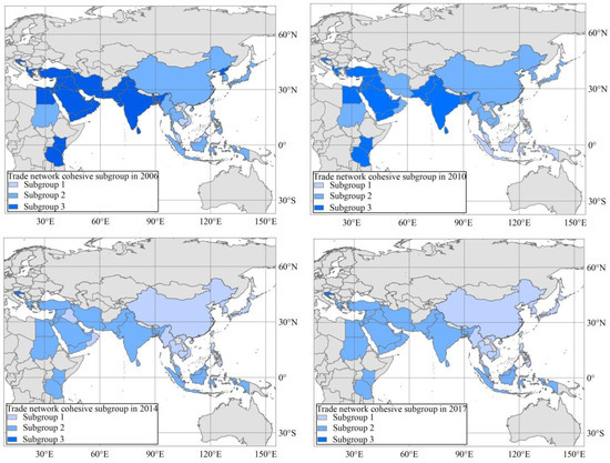 Cohesive subgroup analysis was performed on the MSRCs’ trade network, and ArcGis software was used to visualize it to obtain the MSRCs’ trade network cohesive subgroup maps (Figure 5). In 2006, 2010, 2014, and 2017, the trade network investment was divided into three subgroups. According to the cohesive subgroups analysis, the MSRCs’ trade communities have changed significantly, and the trade network cohesion is weak. In 2006, the division of the MSRCs’ trade network into cohesive subgroups and regional divisions overlapped greatly, and geographically adjacent countries were mostly in the same subgroup (Figure 5). Vietnam, Cambodia, Malaysia, and Singapore belonged to subgroup 1. China and Japan, North Korea, South Korea, Indonesia, Thailand, the Philippines, Myanmar, Brunei, and Sudan are in subgroup 2. Fourteen West Asian countries, four South Asian countries, and five Balkan countries, Egypt, Kenya, and Tanzania, are in subgroup 3. Because the number of countries in subgroup 1 is very small, and subgroup 2 and subgroup 3 occupy dominant positions. In 2010, the number of countries in subgroup 2 increased. Subgroup 1 is clustered in Southeast Asia, and Indonesia, the Philippines, Singapore, and Malaysia are in the same subgroup. Vietnam, Cambodia, Iran, Oman, and North Korea have transferred from subgroup 1 and subgroup 3 to subgroup 2, which China is located in, indicating that the influence of the cohesive subgroups that China belongs to has expanded.
