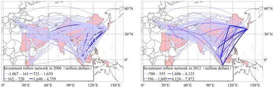 According to the weighted degree measurement of the investment inflow network and the investment outflow network from 2006 to 2012, the network weighted degree of the MSRCs’ investment inflows first increased and then decreased. The average weighted degree of the MSRCs’ investment inflow network increased from 1360.50 in 2006 to 2297.50 in 2010 and then dropped to 1788.92. This shows that in the post-financial crisis period, MSRCs’ investment was sluggish and recovery was slow. From the node weighted degree rankings, Japan, Singapore, and China were the three countries with the highest weighted degree of investment flows in most years, and their centrality in the network of investment flows was higher than that of the other countries (Table 2). The investment inflows of Saudi Arabia, South Korea, the United Arab Emirates, and Indonesia were highly weighted and had a high central position in the investment inflow network. From 2006 to 2012, the centrality of investment inflows in Indonesia, Vietnam, Myanmar, and Cambodia in Southeast Asia increased by 6, 29, 6, and 7, respectively. The centrality and attractiveness of the investment inflows increased significantly. The construction of the China-ASEAN Free Trade Area has promoted a rapid increase in China’s investment in Southeast Asian countries. Japan and South Korea are shifting their industries to Southeast Asia, leading to a rapid increase in the centrality of investment inflows from Indonesia, Vietnam, Myanmar, and Cambodia. Affected by the impact of the financial crisis, the Syrian war, and the “crowding-out effect” brought about by the increasing investment attractiveness of Southeast Asian countries, the weighted investment inflows of oil countries such as Saudi Arabia, the United Arab Emirates, and Syria have dropped by 10, 11, and 5, respectively. Thus, investment attractiveness has declined.