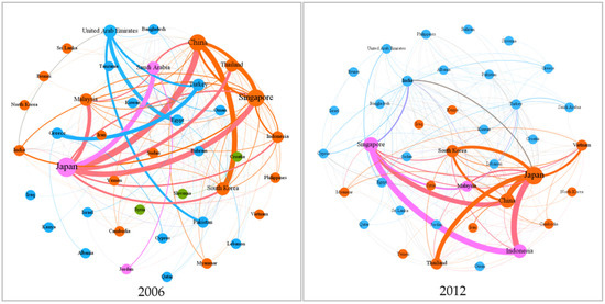 The spatial structure of the MSRCs’ investment outflow also has a significant “core–periphery” structural feature (Figure 9). China, Singapore, and Japan are the core investment outflow countries in the MSRC investment outflow network. China, Singapore, and Japan are not only the countries with the largest investment abroad in MSRCs, but also important investment partners of each other. In 2012, China, Singapore, and Japan invested 8.378 billion dollars, 19.195 billion dollars, and 27.580 billion dollars in MSRCs, respectively. In 2012, Japan invested 7.352 billion dollars and Singapore invested 6.305 billion dollars in China. At the same time, China invested 1.519 billion dollars in Singapore and 211 million dollars in Japan. This indicates that China, Singapore, and Japan have a huge impact on the outflow of investment from MSRCs. Indonesia, South Korea, Malaysia, India, Thailand, and Vietnam constitute the sub-core countries in the MSRCs’ investment outflow network. Cambodia, Saudi Arabia, Iran, and Kuwait constitute the sub-peripheral countries in the MSRCs’ investment outflow network. Yemen, Brunei, Slovenia, and Sudan constitute the most marginal countries in the MSRCs’ investment outflow network. It is worth noting that the rapid rise in South Korea and Indonesia’s node status in the investment outflow network from 2006 to 2012 has had a certain impact on the core status of China, Japan, and South Korea.