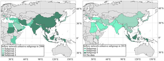 Cohesive subgroup analysis was performed on the MSRCs’ investment network, and ArcGis software was used to visualize it to obtain the MSRCs’ investment inflow network and the MSRCs’ investment outflow network cohesive subgroup maps (Figure 10 and Figure 11). The investment inflow network of MSRCs’ cohesive subgroups does not have significant regional characteristics, and most countries in the same region are in different subgroups (Figure 10). In 2006, the investment inflow network was divided into four subgroups. Japan, Saudi Arabia, and Jordan were in subgroup 1, and Slovenia, Croatia, and Syria constituted subgroup 2. Albania, Greece, Cyprus, Lebanon, Israel, Egypt, Kenya, Tanzania, Iraq, Kuwait, Bahrain, Qatar, the United Arab Emirates, Oman, Pakistan, and Bangladesh constituted subgroup 3. China, North Korea, South Korea, Southeast Asian countries, Sri Lanka, India, Iran, Yemen, and Sudan constituted subgroup 4. Subgroup 4, in which China is located, is the most widely distributed and constitutes the most dominant community in the investment inflow network of MSRCs. In 2012, the investment inflow network was divided into 3 subgroups. The number of cohesive subgroups of MSRCs’ investment inflow network decreased. The scope of subgroup 3 was replaced by subgroup 1 and subgroup 2, and the scope of subgroup 4 shrank significantly. China, North Korea, South Korea, Japan, Myanmar, Thailand, Vietnam, Cambodia, Iran, Iraq, Yemen, Syria, and Kenya constituted subgroup 1; Malaysia, Singapore, and Indonesia constitute subgroup 4; and other countries constitute subgroup 2. It is worth emphasizing that from 2006 to 2012, the subgroup in which China is located split into three subgroups after the financial crisis, and the pattern dominated by the four subgroups before the financial crisis was broken.