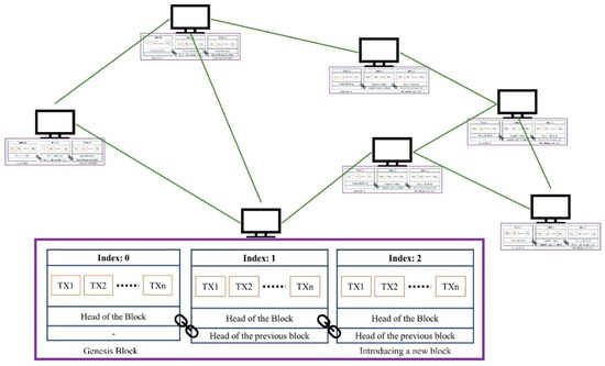 Blockchain ensures that a transaction is approved and validated based on unanimous consent. The main characteristic of the distributive ledger is that it does not have any centralized administration or centralized data storage and functions on the basis of a decentralized distribution system [28]. Whenever a participant of a blockchain network initiates a transaction, the details are shared and broadcasted to the entire network to be accessed by other network members and approved on the basis of the agreement of the network members. In this manner, all the transactions are created and validated individually to create a block of data that is secured and can never be altered or deleted later. Thus, a blockchain carries and stores the records of transactions as a chain of data blocks that is accessible across the shared network. The main features of blockchain can be summarized into four core characteristics [29] as shown in Table 1, and a simple blockchain network architecture is shown in Figure 2.