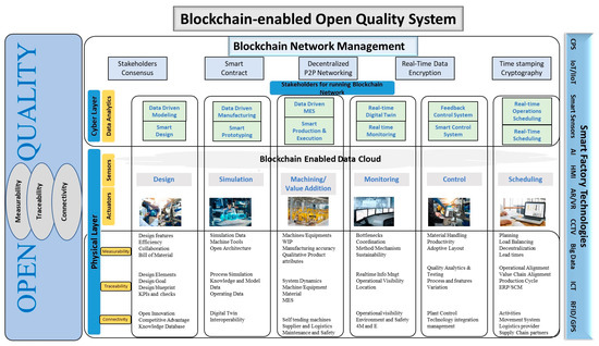 Blockchain-enabled open quality system consists of blockchain platform with the smart contracts and IoT smart devices, i.e., sensors and actuators providing secure and accurate information through safe distributed ledger with various quality information, asset information, stakeholders’ information, logistics information and transaction information. Using this information or data, smart contracts are created automatically to execute quality management and improve the efficiency of the overall manufacturing value chain. Digital identity is used to control the access and authority to the data to keep the confidentiality and privacy of the network members.