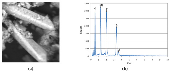 Siciliano et al. [31] recovered MgKPO4·6H2O with a high purity grade from agro-industrial waste after an integrated treatment of three technologies (anaerobic digestion, supercritical water gasification (SCWG), and nutrient recovery). The liquid phase from the SCWG was suitable for the recovery of phosphorus in the form of K-struvite because ammonia was removed during gasification. The precipitate recovered from the precipitation process conducted at pH = 10 and Mg/P = 1 analyzed using SEM showed the presence of crystals with the typical orthorhombic shape of pure magnesium potassium phosphate (Figure 2a) and the presence of Mg, K, and P (Figure 2b) in a molar ratio of about Mg:K:P = 1:1:1.03.