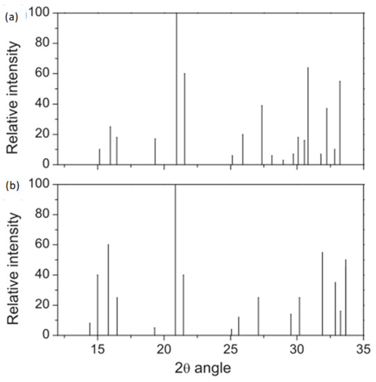 XRD diffractogram in the 2θ range 10–35 of the standard (a) MgKPO4·6H2O (Powder Diffraction File (PDF) No. 35-0812) and (b) MgNH4PO4·6H2O (Powder Diffraction File, PDF No. 15-0762), [14]. Reprinted/adapted with permission from Elsevier.