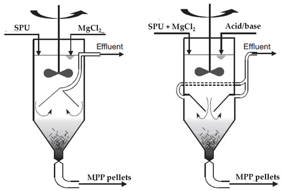 Wilsenach et al. [17] designed a CSTR with a specific liquid/solid separator to overcome the scaling problem observed in downstream conduits and to improve the settling characteristics of MAP or MPP crystals. The separator was constructed in two forms; namely, as inward and outward flow devices (Figure 4). A severe scaling problem occurred during all MAP experiments; at least 50% of the total volume of crystals attached to the CSTR wall, the impeller blades, and the outside of the internal effluent pipe, while a thin layer of crystals formed on the reactor wall during MPP precipitation experiments. This excessive scaling was explained by the localized superstations promoting primary nucleation instead of secondary crystal growth. The fine crystal problem observed in the effluent of the CSTR with an inward flow device was solved by using the outward flow device (depicted in the second reactor). To avoid the scaling and to produce crystals with a good settling character, the authors recommended that: (i) mixing and suspension of particles should be increased while the mixing speed is decreased to limit the centrifugal force and wall scaling; (ii) instead of primary nucleation, the secondary crystal growth must be promoted; (iii) diffuse dosing systems, rather than point dosing of reactants, can be used to prevent the localized supersaturation; and (iv) the above-mentioned operational problems can be handled by a reactor design based on computational fluid dynamics [17].