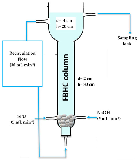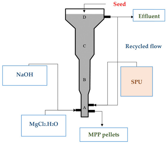 Fluidized bed crystallization (FBC) is the most utilized recovery method applied to nutrient rich streams and wastes such as SSHU, swine waste, and manure [30,67]. This process is capable of recovering the N, P, and K as MAP or MPP pellets with a low water content. The main advantages of the process are low chemical requirements and the usage of the produced pellets as a slow-release fertilizer for agricultural and gardening purposes [30]. The process also has some shortcomings in terms of seed requirements and a need for a high recirculation flow and up-flow velocity with a longer CRT [87]. Under moderate supersaturation conditions, the crystallization process in a FBR can be realized without using seeds. In this case, high-purity pellets were produced during the homogenous crystallization that took place in the FBHC column. Le et al. [30] used a FBHC column (schematized in Figure 5) for simultaneous P and K recoveries from the SPU. As will be explained in detail in Section 4.1, the operational parameters were optimized to attain the highest recovery efficiencies and to produce the pellets with the highest purity. The authors pointed out that the fluidization and up-flow velocities had a significant effect on the process performance. The minimum fluidization velocity (Umf) and optimum up-flow velocity of the FBHC process were determined to be 14.98 m·h−1 and 25–35 m·h−1, respectively, to maximize the K and P recovery in their experimental conditions.