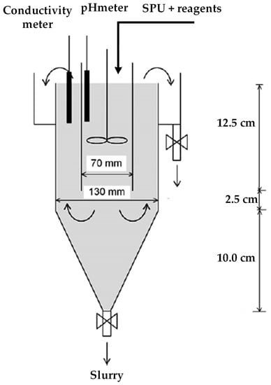The reactor type and its configuration are considered to be important parameters that influence the process performance. Depending on the reactor geometry and its design characteristics, some operational problems may occur through K-struvite precipitation. Fine crystal formation is the most frequently reported problem faced during precipitation applications. Generally, uncontrolled primary nucleation due to localized supersaturation promotes the formation of the fines with a poor settling character. Sometimes the attrition and breakage of MPP pellets formed during the operation create a similar settling problem. As the crystal size of these fines ranges between 60 and 100 μm, the formation of fine crystals results in unsatisfactory K and P recovery efficiencies due to poor solid–liquid separation [67]. Another problem faced during precipitation applications is the scaling/fouling that occurs on the reactor walls and downstream conduits due to poor mixing or suspension conditions. Therefore, the selection of the reactor type and optimization of its operational conditions are of importance in achieving large MPP crystal sizes with a good settling character that yield a higher process performance. Within this context, various types of reactors such as stirred-tank reactors (STRs) [17,23], fluidized bed reactors (FBRs) [30,67], a draft tube and baffle reactor (DTBR), [29,75] and a bubble column reactor with draft tube (BCRDT) [15,50] have been developed for MPP crystallization (Table S1).