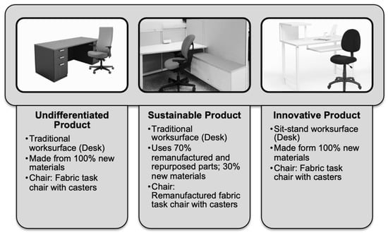 The undifferentiated product option was described as a standard, traditionally manufactured office workspace made from 100% new materials. The innovative product option was described to be a non-traditional, modern design workspace consisting of a work surface that offers observably innovative sitting and standing functionality and a task chair. In this case, the sit–stand workspace was deemed to represent an innovative product option per the previously stated distinction of an observable design innovation that was differentiated from the traditional product design. In describing the sustainable product option, it was specified explicitly that the workspace had been remanufactured. Respondents were further informed that remanufacturing offers an environmentally beneficial impact over traditionally manufactured products. Figure 1 describes the attributes of the products used in the survey. In addition to being provided with this information, respondents were also exposed to color photos of each of the undifferentiated, sustainable, and innovative product options.