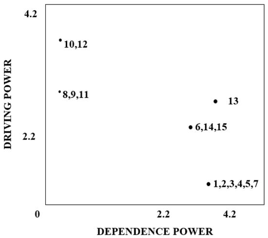 The ISM results are undertaken for the application of the fuzzy Matrice d’Impacts Croisés Multiplication Appliquée a un Classement (MICMAC) application. With the step-by-step process discussed, a fuzzy MICMAC stabilized matrix is obtained. Based on the stabilized matrix, four clusters are made: autonomous, dependent, linkage, and driving, and they are presented in Figure 3.