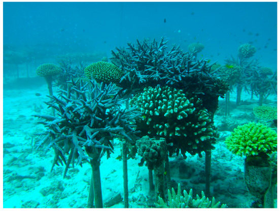 Coral stick culture grows corals on the sand and gravel bottom, where corals normally do not grow, and cultivates corals at a height of 50 cm above the seafloor (Figure 1). OVFC cultured 54 species of corals from 11 families. Since 2009, the fisheries cooperative, a Mozuku processing company, and consumer co-ops have collaborated to create the “Mozuku fund” to contribute to coral reef restoration. Specifically, one to two yen per pack of processed Mozuku is set aside in the Mozuku fund, and the money is used for coral culture. Twenty-eight co-ops (6.7 million members) across Japan had cooperated, and by 2015, more than 10 million pack money had been set aside in the fund and 24,000 corals had been cultivated [12].