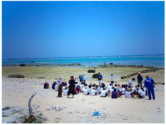 The restoration work was a large-scale project involving the PTA (parent–teacher association) and students of Shiraho Elementary School and Junior High School. The stone tidal weir was about 200 m parallel to the coastline, 70 m offshore, and the height of the stone wall was about 1 m. Since its completion in October 2006, the site has been used as a place for local children to experience nature and for environmental education (Figure 2) [16].