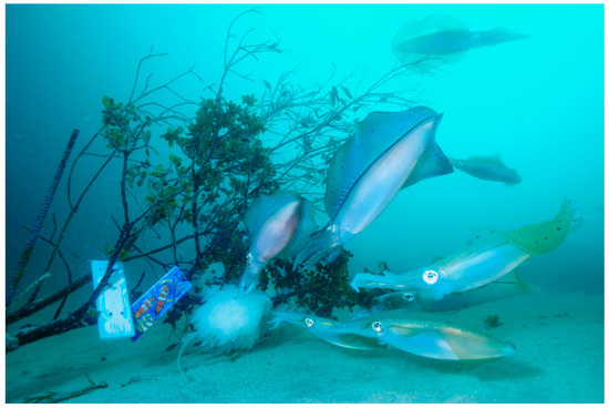 On Kashiwa Island, there is a fishing method called “Shibazuke,” in which fishers tie stones to a broadleaf bush called Ubamegashi and place them in the sea, and this method was applied. The installation site was in a sandy area about 20 m deep. In the first year, divers and fishers went into the mountains together to cut down branches of Ubamegashi. Sandbags were attached to the branches, placed in the installation point, and the divers dove down to secure them in place. The squid responded quickly, and one after another, eggs were laid on the spawning beds (Figure 4). This year, the squids laid up to 10,000 egg sacs per spawning bed, and 70,000 to 80,000 eggs per spawning bed. Normally, a few dozen to several hundred egg sacs per spawning bed is considered a success, so the challenge was a great success [20].