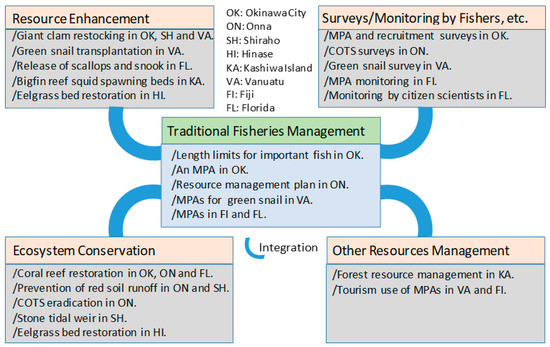 Figure 6 shows the integration of various approaches, such as resource enhancement, ecosystem conservation and surveys and monitoring by fishers and local people, and other resources management to traditional fisheries resource management. Social–ecological systems in many coastal areas are extremely complicated and highly uncertain. It is sometimes difficult to manage the fisheries resources with only the traditional management methods and needs to incorporate such various approaches, as appeared in this review. To integrate these approaches, the transdisciplinary processes, which are the co-design of the research agenda, the co-production of integrated knowledge, and the co-delivery of research outcomes in collaboration with diverse stakeholders, are required. Satoumi processes, which are environmental conservation and resource management in which local people are closely involved, are also required.