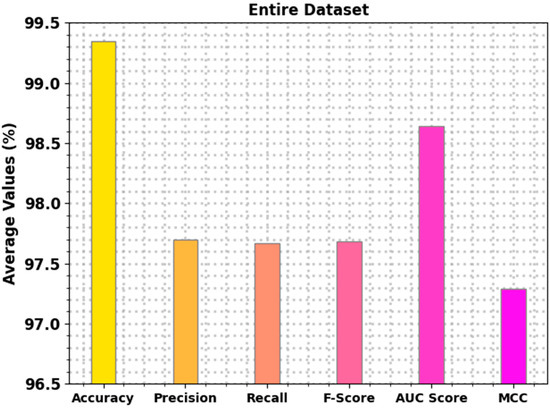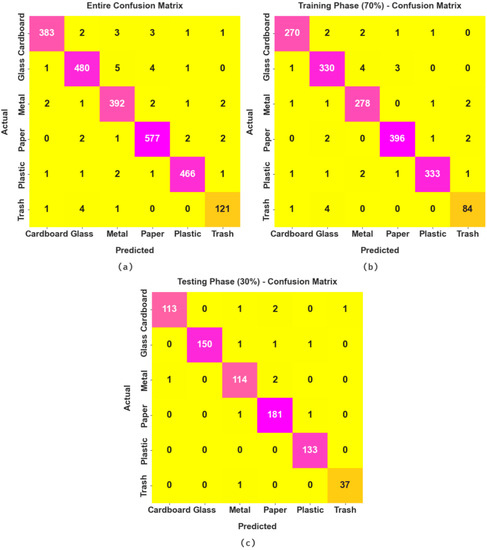 Table 2 demonstrates brief waste classification results of the AEOIDL-SWM method. Figure 5 examines the waste classification results of the AEOIDL-SWM system on the entire dataset. The AEOIDL-SWM model classified cardboard samples with of 99.39%, of 98.71%, of 97.46%, of 98.08%, of 98.61%, and MCC of 97.72%. In addition, the AEOIDL-SWM system categorized metal samples with of 99.19%, of 97.03%, of 98%, of 97.51%, of 98.71%, and MCC of 97.03%. Moreover, the AEOIDL-SWM approach categorized trash samples with of 99.51%, of 95.28%, of 95.28%, of 95.28%, of 97.51%, and MCC of 95.02%.