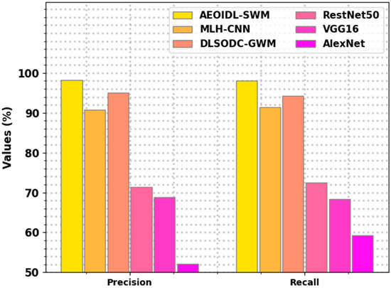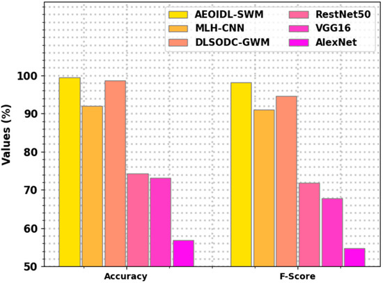 Table 3 depicts a detailed comparative examination of the AEOIDL-SWM approach with other DL algorithms [15]. Figure 12 illustrates comparative and results of the AEOIDL-SWM model over other models. The outcomes point out the enhanced results of the AEOIDL-SWM system. Based on , the presented AEOIDL-SWM model achieved an improved of 99.42%, whereas the MLH-CNN, DLSODC-GWM, ResNet50, and VGG16 models obtained a reduced of 91.94%, 98.73%, 74.31%, 73.12%, and 56.88%, correspondingly. Meanwhile, based on the , the presented AEOIDL-SWM model has accomplished a better of 98.10%, while the MLH-CNN, DLSODC-GWM, ResNet50, and VGG16 approaches a exhibited lower of 91.09%, 96.64%, 71.78%, 67.78%, and 54.69%, correspondingly.