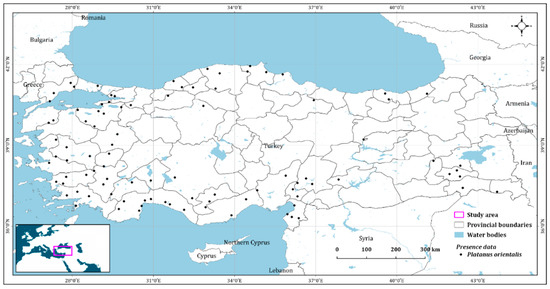 For this study, the coordinates of 117 points representing the geographical distribution areas of Platanus orientalis were identified using information from the literature, online databases [53], Flora of Turkey [54], and the BIYOD data of the Ministry of Agriculture and Forestry [55]. These were then plotted on a Google Satellite Hybrid high spatial resolution (5 m) map obtained using the QMS file extension (NextGIS, Tallin, Estonia) in QGIS 3.22.7 (QGIS.org, Grüt (Gossau ZH), Switzerland) (Figure 3).