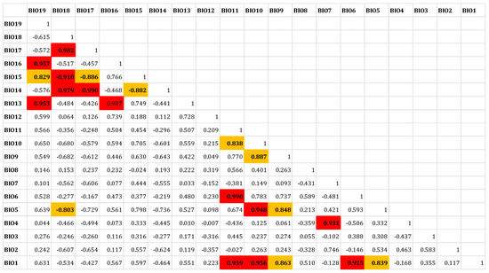 The results of the Pearson correlation test, carried out as specified in the Section 2 to solve the problem of multicollinearity, are shown in Figure 4. Variables greater than r > ±8 and which weaken the predictive strength of the model were removed and the variables BIO2, BIO3, BIO7 (r > ±8—BIO4), BIO8, BIO9 (r > ±8—BIO10, BIO5), BIO11 (r > ±8—BIO6, BIO1), BIO12, BIO18 (r > ±8—BIO17, BIO15, BIO14), and BIO19 (r > ±8—BIO16, BIO13) were used in the model.