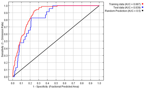The AUC value worked out at 0.887 with a standard deviation of 0.005 (Figure 5). The closer the AUC test value is to 1, the better the discrimination, the more precise and descriptive the model [62]. Since it is between 0.8 and 0.9, the predictive ability of the model is defined as strong and is considered to be much more accurate than random predictions [63,64]. According to the results of the jackknife test, the variable producing the greatest gain when used on its own was the annual precipitation (BIO12). This was thus accepted as the variable providing the most useful information when used alone. The bioclimatic variable that most reduces the gain when ignored was, once again, the annual precipitation. The BIO12 variable is thus considered to be the variable that encompasses the most information not provided by other variables (Figure 6).