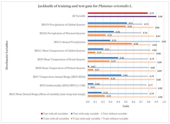 Numerous studies have demonstrated the many adverse effects of climate change on plant and animal species, including shrinking habitats, declines in biodiversity, and even the endangerment/extinction of some species [71,72,73]. This study identified the spatial changes that are likely to be experienced in the current distribution areas of Platanus orientalis L. by modelling predicted distribution areas for the periods 2041–2060 and 2081–2100 using the SSP2 4.5 and SSP5 8.5 scenarios. Models with high prediction accuracies were obtained (AUC value = 0.887 and standard deviation = 0.005). According to the jackknife test results, the environmental factors which will affect the geographical distribution of Platanus orientalist L. the most are the bioclimatic variables of annual precipitation (BIO12) and amount of precipitation in the coldest season (BIO19). It can thus be concluded that these variables carry more importance than the other variables used in the models and have greater impacts on the geographical distribution of Platanus orientalis L. This finding is consistent with existing knowledge of the species, which seeks out humid soils for itself such as valleys and riverbanks, and of its need for humidity, particularly during the dry seasons, despite its toleration of semi-arid areas [52]. Moreover, the impact of the average temperature during the driest season variable (BIO9) supports the consistency of the models obtained.