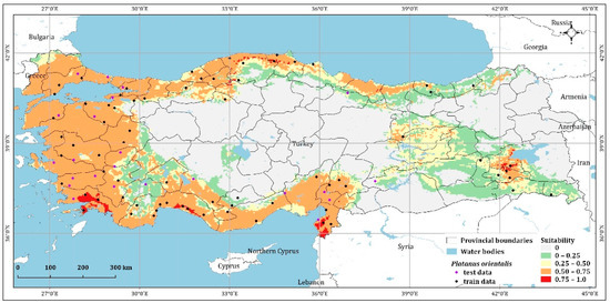 MaxEnt produces a continuous raster with values ranging from 0 to 1, representing relative habitat suitability. There is no set rule to establish thresholds; model performance instead depends on the data used or the mapping objective, and therefore varies among species. From our MaxEnt analysis, we obtained threshold values based on a variety of statistical measures; these values were saved in a file called “maxentResults.csv”. Some of the most used thresholds are a minimum training presence logistic threshold, 10th percentile training presence logistic threshold, and equal training sensitivity and specificity logistic threshold [62]. In this study, 10th percentile training presence logistic thresholds were applied. The results of the model were converted into distribution maps with the QGIS 3.22.7 program using the raster/vector conversion function. In the MaxEnt model, the presence of a species in an area is stated using a value of between 0 and 1. As the value approaches 1, the potential presence of the species in the area increases. On the potential distribution maps created for today and the future, the degrees of suitability of the areas for the spread of the species were categorized as follows: 0 = not suitable, 0–0.25 = slightly suitable, 0.25–0.50 = somewhat suitable, 0.50–0.75 = suitable, and 0.75–1 = very suitable. This classification for relative suitability degrees was determined on the basis of previous successful cases in the literature [67,68,69]. Such an equal interval classification allowed the comparison of potential distributions of Platanus orientalis L. created for today and the future, highlighting changes in the extreme values in our maps. The predicted distribution areas for today and in the future were then calculated in square kilometers according to this classification [67,70]. Finally, a change analysis was conducted for the comparison of the predicted distribution areas of Platanus orientalis L. for the periods of 2041–2060 and 2081–2100 in the SSP2 4.5 and SSP5 8.5 scenarios with the current potential distribution areas. In order to detect the change, the suitability categories were coded 0 = 0, 0–0.25 = 1, 0.25–0.50 = 2 0.50–0.75 = 3, and 0.75–1 = 4, and then the potential distribution maps were intersected. Areas with the suitability values 0–0 were treated as “unsuitable” areas, areas that remained in the same category as “stable” areas, areas that moved up to a higher category as “gains”, and areas that moved down to a lower category as “losses”. The total extent of each of these areas was calculated in square meters and change maps were drawn to display the direction and size of the change.