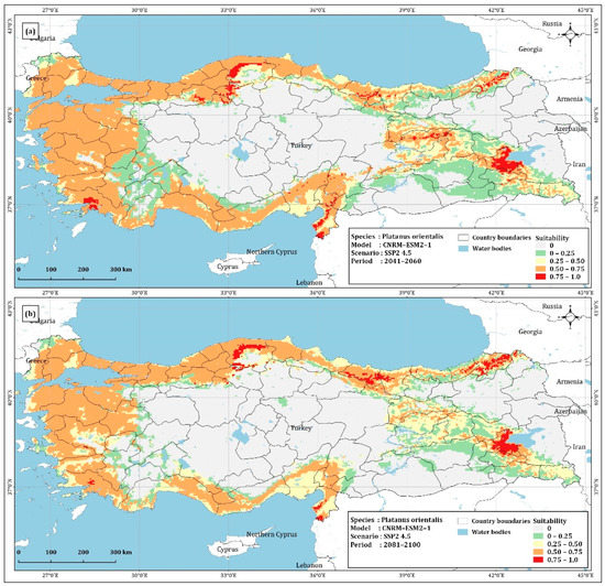 Predicted distribution areas of Platanus orientalis L. according to the SSP2 4.5 scenario for the periods (a) 2041–2060 and (b) 2081–2100 based on the CNRM-ESM2 climate model.