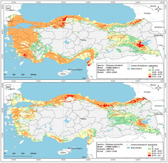 Predicted distribution areas of Platanus orientalis L. according to the SSP5 8.5 scenario for the periods (a) 2041–2060 and (b) 2081–2100 according to the CNRM-ESM2 climate model.