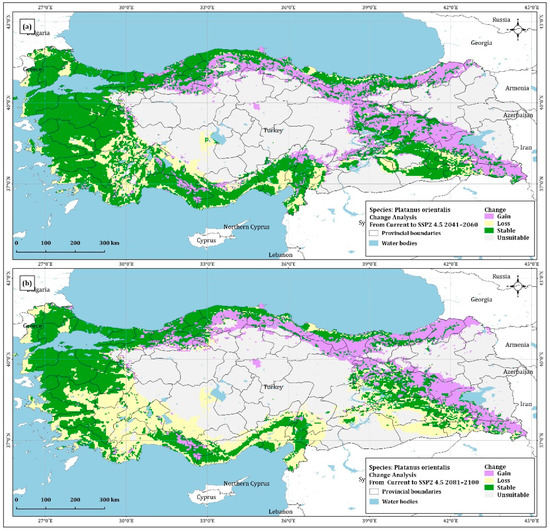 Changes in the predicted distribution areas of Platanus orientalis L. according to the SSP2 4.5 scenario for the periods (a) 2041–2060 and (b) 2081–2100 according to the CNRM-ESM2 climate model.