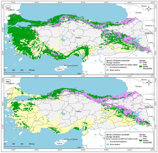 Changes in the predicted distribution areas of Platanus orientalis L. according to the SSP5 8.5 scenario for the periods (a) 2041–2060 and (b) 2081–2100 according to the CNRM-ESM2 climate model.
