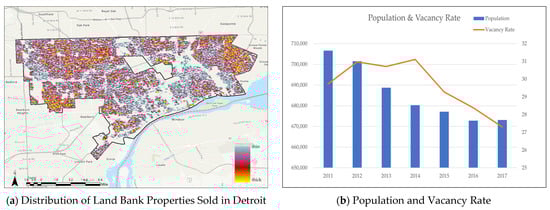 Land banks were established to manage vacant and abandoned properties that had been left unmanaged, promote urban redevelopment, and restore unmanaged real estate [14]. Figure 1 shows the distribution of land bank properties that were sold in Detroit (a) and Detroit’s population and vacancy rate patterns between 2010 and 2016 (b).